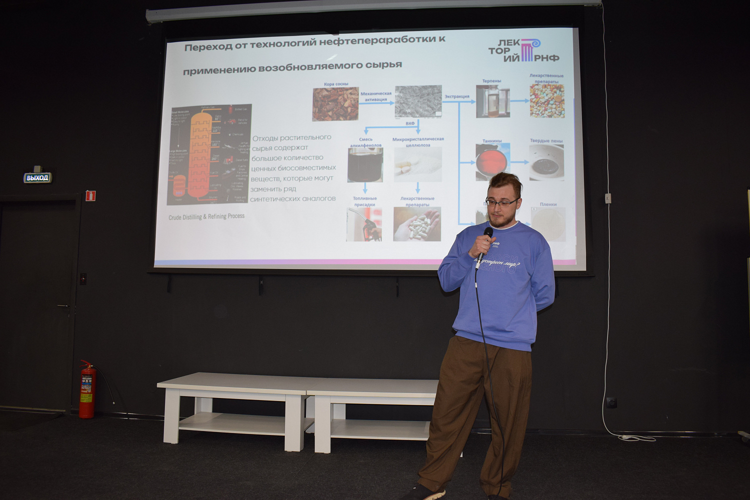 Вторым выступил Владислав Ионин. Его доклад был посвящен возобновляемому сырью из древесных отходов, листьев и другой биомассы. Лектор рассказал о потенциале такого сырья как замены бензина и других видов топлива, а также о процессе получения целлюлозы из биомассы и ее дальнейшем применении в производстве тканей, различных материалов и в фармацевтике.